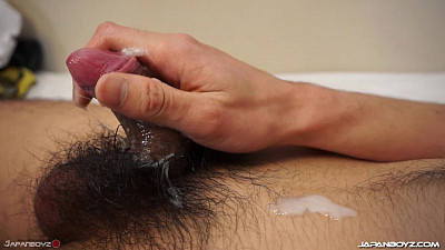 Brushing a hand over his furry nuts, Ryuzaki keeps up a steady pace as he pumps his dick. His breathing quickens to a pant as his prick tightens up and sprays cum. His beating hand is sticky and drenched with hot creamy man juice as he lies back to relax.