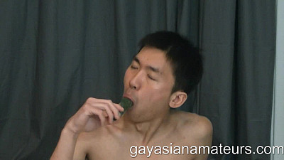 Meet Kei. Meet cucumber. Meet Kei with cucumber. You guys seem to like and request some kinky asian boy sex and here you go. Kei starts by giving the cucumber a blowjob, and obviously this hot Asian boy has had a big cock or two in his mouth before. He then takes the cucumber in his ass and gives himself a good fuck. Once again, this hot Asian boy must surely know how to take a big cock up that Asian ass. He ends up fucking the cucumber in just about every position imaginable until he shoots a hot load of cum and eats it. I wonder what is better for me, the load of cum with all the protein or the cucumber? I would prefer his hot load of cum in my mouth. Never cared too much for veggies. Then again the piss that he shoots all over his body would sure be nice in my mouth as well. Too many choices...