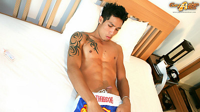 Just looking at Rock makes me hard, so I invited this gay Asian muscle stud back to my place for a bit of fun. He arrived wearing some sexy muai Thai boxer shorts, which he knows I have a fetish for. Soon I could see his hard cock peeking out of the shorts, so with one hand on his rippling abs and the other hand on his cock I began fluff this Asian stud, capturing photos any which way I could.