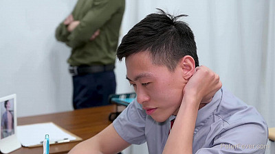 Yowei perches on the desk with legs up and wide open. "Mr. Yowei, your ass feels so GOOD!" the nerdy student blurts out between thrusts. Yowei steps over to the blackboard and braces against it as Hen follows to slam in his bare cock. He holds Yowei by the muscular shoulders as he pumps in to the root. He's drilling so hard and deep the blackboard nearly topples. Spread out on the desk once more, Yowei moans as Hen speeds up for a juicy finish. After he showers the new teacher with creamy student cum, Hen watches Yowei geyser out a fountain of his sperm. As Hen thanks the teacher for "this wonderful experience," Yowei reminds him to keep getting good grades and he will get more hot hungry teacher butt in return."