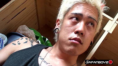 Sometimes, a hot Japanboyz' gotta do what a boy's gotta do. Blond Asian hipster Yuki is on the storeroom floor relaxing when he reaches into his pants to pull out a stiff dick. He stands up just long enough to step out of his jeans and pull his briefs down below his nuts. Back on the floor he starts beating his cock and worships the manly scent embedded in his undies. One hand goes down to his booty to spread his cheeks apart. Then he gets on all fours with puckering holeaimed at the camera, reaches up and slides a slick finger into his hungry ass. Then two.